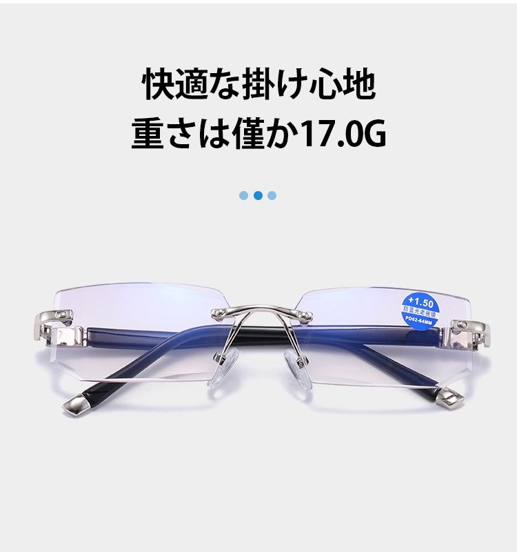 【ブルーライトカットリムレス老眼鏡】ブルーライトカット、リムレス、耐磨耗、耐衝撃、軽量
